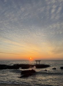 翌朝は5時に起きて海にある鳥居のところから出る日の出を見ることもできました。よく晴れていて素晴らしい景色を見ることができました。